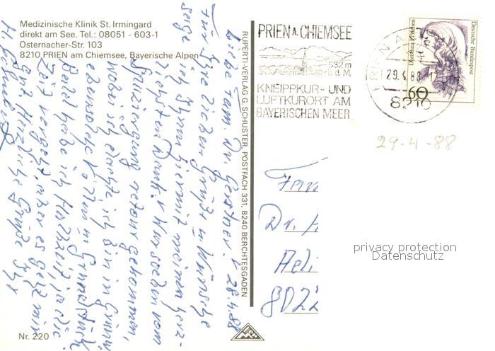 73073991 alte Postkarte Prien Chiemsee Med Klinik St Irmingard Hochfelln Hochgern Fahrgastschiff postalisch gelaufen Erhaltung siehe scans [WerneD78] KatCode: 11110009187162