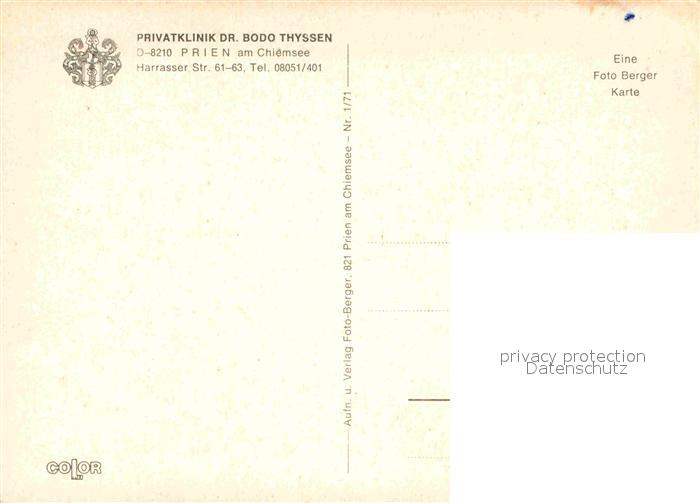 72696720 Prien Chiemsee Privatklinik Dr Bodo Thyssen Alpenpanorama postalisch nicht gelaufen Erhaltung siehe scans [FriedD77] KatCode: 11110009187162