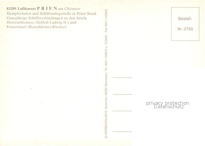 73643726 Prien Chiemsee Schiffsanlegestelle Herrenchiemsee Schloss Ludwig II und Fraueninsel Benediktiner Kloster Fliegeraufnahme postalisch nicht gelaufen Erhaltung siehe scans [WerneD78] KatCode: 11110009187162