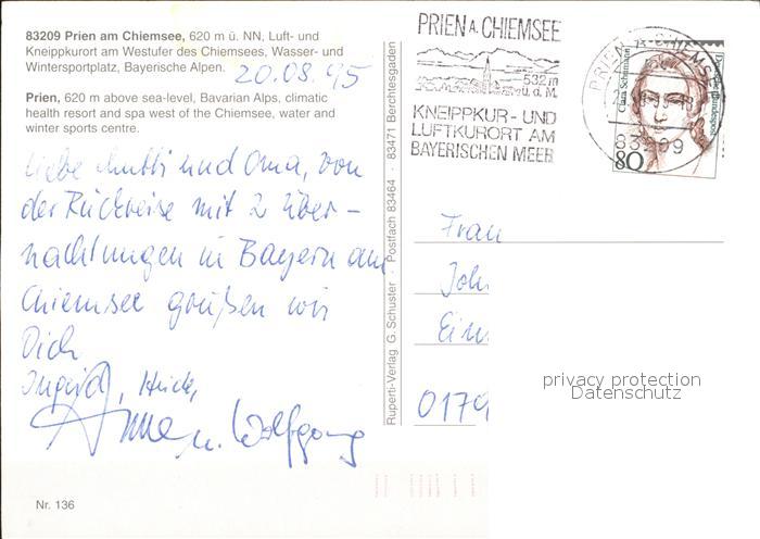 72368139 alte Postkarte Prien Chiemsee Stadtblick Kirche Eisenbahn Fahrgastschiff postalisch gelaufen Erhaltung siehe scans KatCode: 11110009187162