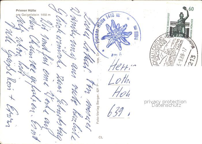 72454250 alte Postkarte Priener Huette Geigelstein postalisch gelaufen Erhaltung siehe scans KatCode: 11110009187114