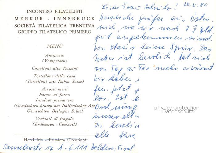 old postcard Primiero Chiesa La Pieve Hotel Iris Speisekarte postalisch gelaufen Erhaltung siehe scans [FriedD77]