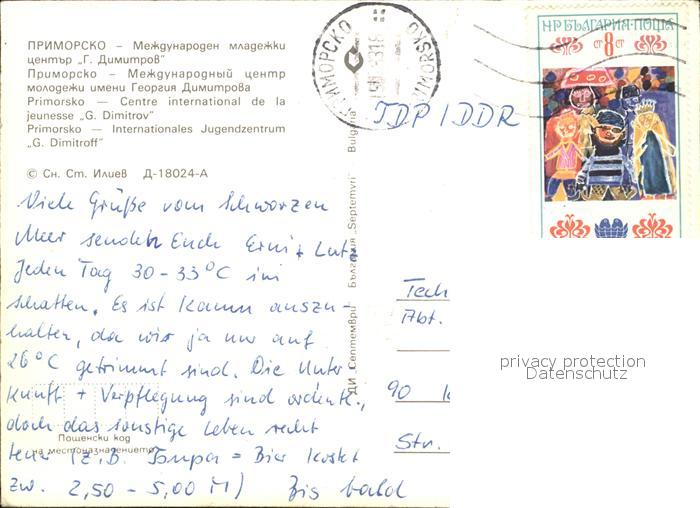 old postcard Primorsko Strand Internationales Jugendzentrum Dimitrov postalisch gelaufen Erhaltung siehe scans