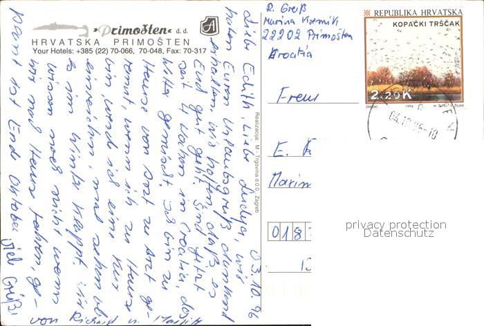 old postcard Primosten Fliegeraufnahme Hrvatska Strand Terrasse postalisch gelaufen Erhaltung siehe scans