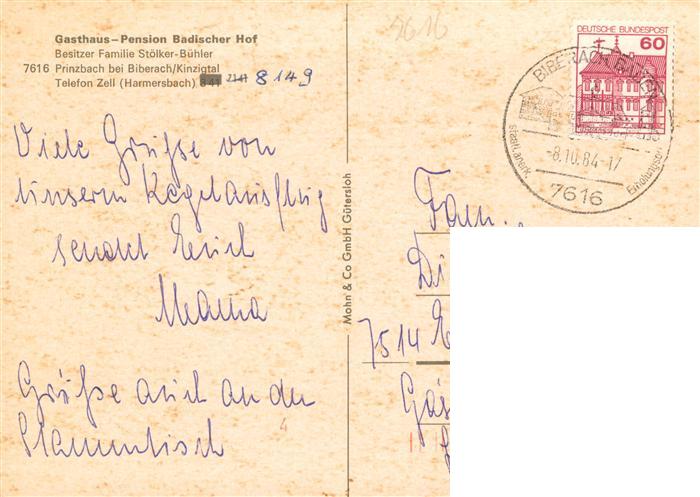 73930843 alte Postkarte Prinzbach Biberach Kinzigtal Gasthaus Pension Badischer Hof postalisch gelaufen Erhaltung siehe scans [FriedD77] KatCode: 11110008317011
