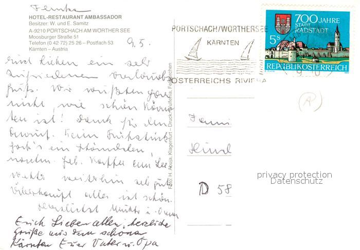 73586720 alte Postkarte P?rtschach W?rthersee Hotel-Restaurant Ambassador postalisch gelaufen Erhaltung siehe scans [PaolaD17] KatCode: