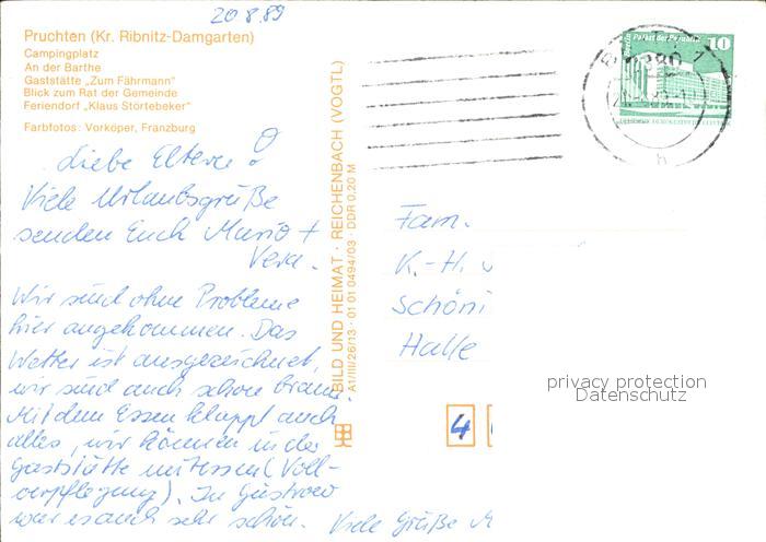 72370901 alte Postkarte Pruchten Mecklenburg Vorpommern Campingplatz An der Barthe Gaststaette Zum Faehrmann postalisch gelaufen Erhaltung siehe scans KatCode: 11110013057070