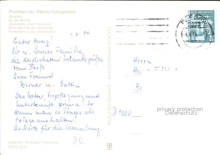 72393625 alte Postkarte Pruchten Mecklenburg Vorpommern Zeltplatz Barthe Gaststaette Zum Faehrmann postalisch gelaufen Erhaltung siehe scans KatCode: 11110013057070