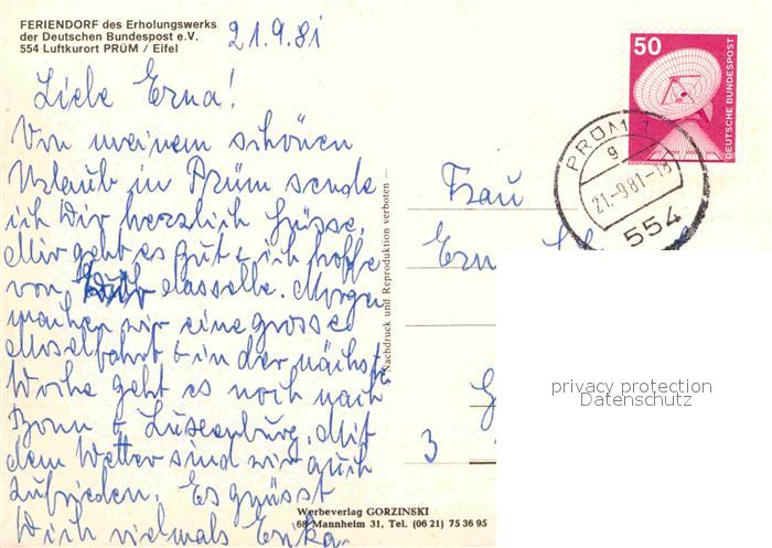 72885251 alte Postkarte Pruem Eifel Feriendorf der Dt Bundespost Speisesaal Panorama postalisch gelaufen Erhaltung siehe scans [WerneD78] KatCode: 11110007232108