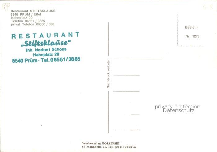 71928068 Pruem Eifel Restaurant Stiftsklause postalisch nicht gelaufen Erhaltung siehe scans KatCode: 11110007232108