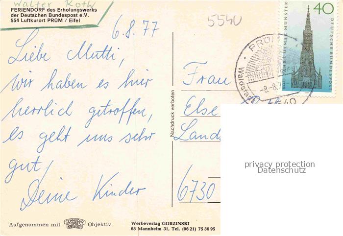74055012 alte Postkarte Pruem Eifel Rheinland-Pfalz Feriendorf des Erholungswerks der Deutschen Bundespost Gaststaette Appartement postalisch gelaufen Erhaltung siehe scans [WerneD78] KatCode: 11110007232108
