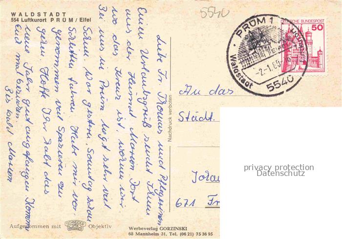 74055006 alte Postkarte Pruem Eifel Rheinland-Pfalz Fliegeraufnahme postalisch gelaufen Erhaltung siehe scans [WerneD78] KatCode: 11110007232108