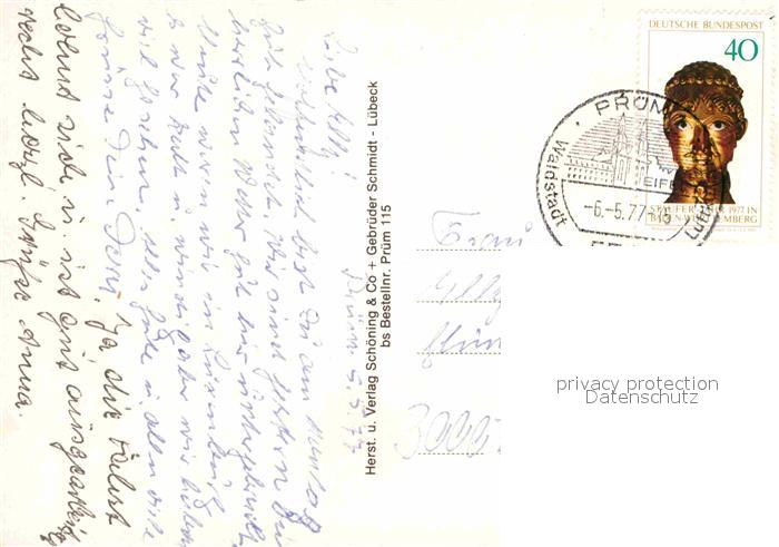72741783 alte Postkarte Pruem Eifel Teilansichten Salvator Basilika Jugendherberge Bischoefl Konvikt Waldschwimmbad postalisch gelaufen Erhaltung siehe scans [WerneD78] KatCode: 11110007232108