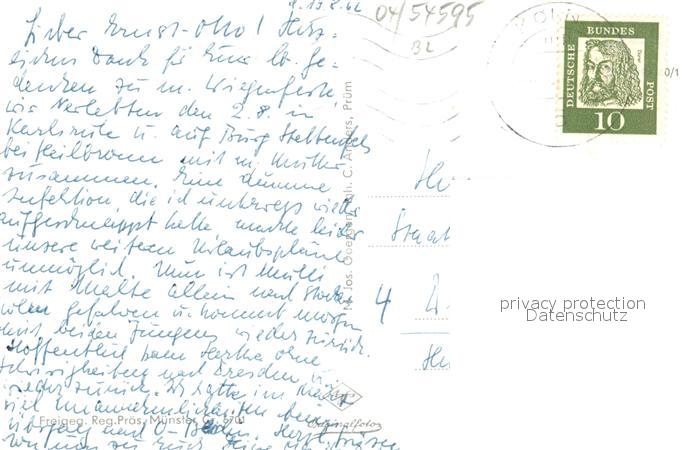 73084344 alte Postkarte Pruem Eifel Waldstadt der Eifel Fliegeraufnahme postalisch gelaufen Erhaltung siehe scans [FriedD77] KatCode: 11110007232108