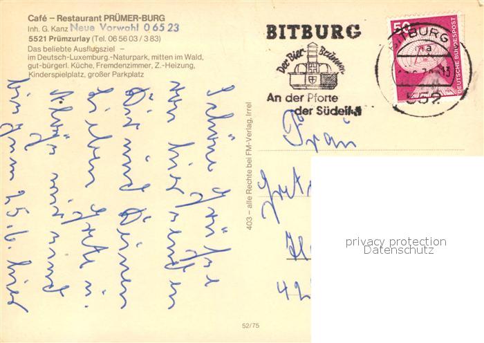 73168668 alte Postkarte Pruemzurlay Restaurant Cafe Pruemer Burg postalisch gelaufen Erhaltung siehe scans [KathaD81] KatCode: 11110007232108