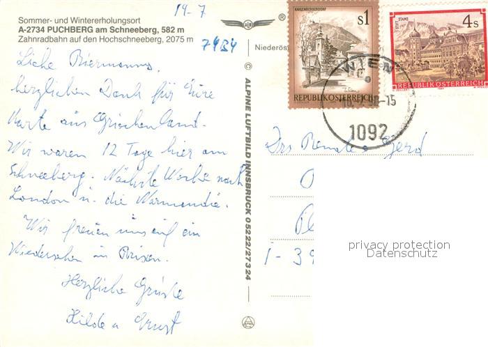 73667729 alte Postkarte Puchberg Schneeberg Fliegeraufnahme mit Zahnradbahn auf den Hochschneeberg postalisch gelaufen Erhaltung siehe scans [WerneD78] KatCode: 11390122031826