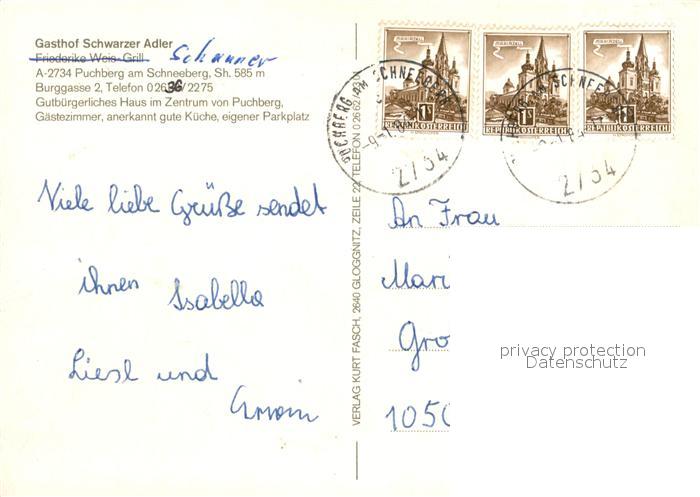 73323845 alte Postkarte Puchberg Schneeberg Gasthof Schwarzer Adler postalisch gelaufen Erhaltung siehe scans [WerneD78] KatCode: 11390122031826