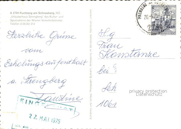 72416387 alte Postkarte Puchberg Schneeberg Urlauberhaus Strengberg Bar Restaurant Swimming Pool Alpenpanorama Wappen postalisch gelaufen Erhaltung siehe scans KatCode: 11390122031826