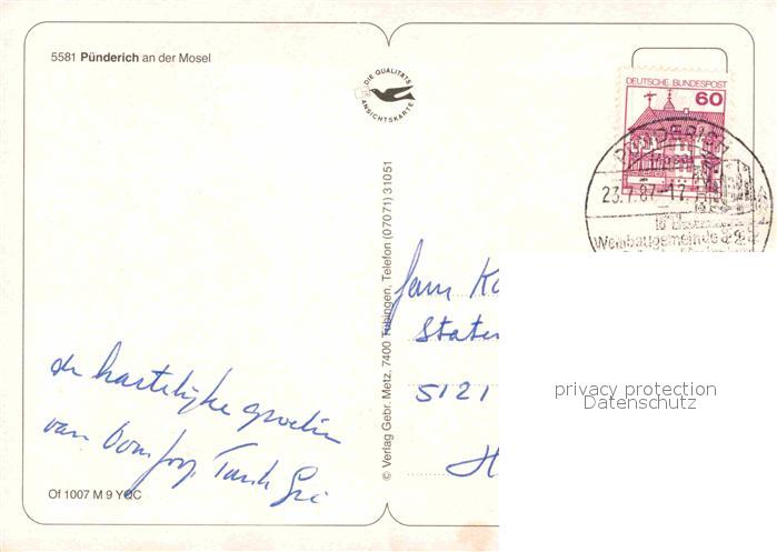 72864925 alte Postkarte Puenderich Mosel Weindorf Fliegeraufnahme Moselpartie postalisch gelaufen Erhaltung siehe scans [LiesaD40] KatCode: 11110007135073