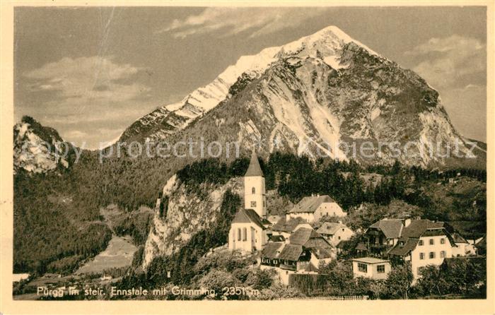 73136984 alte Postkarte Puergg-Trautenfels Ortsansicht mit Kirche Blick zum Grimming Dachsteingebirge postalisch gelaufen Erhaltung siehe scans [FriedD77] KatCode: 11390222061235