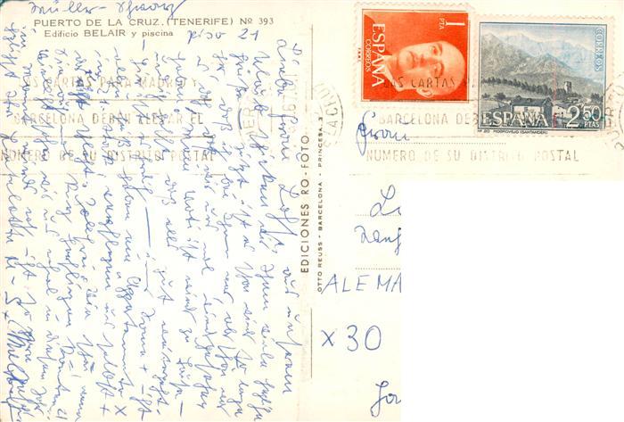 73908094 old postcard Puerto-de-la-Cruz Tenerife ES Edificio Belair y piscina postalisch gelaufen Erhaltung siehe scans [WerneD78] KatCode: 11510