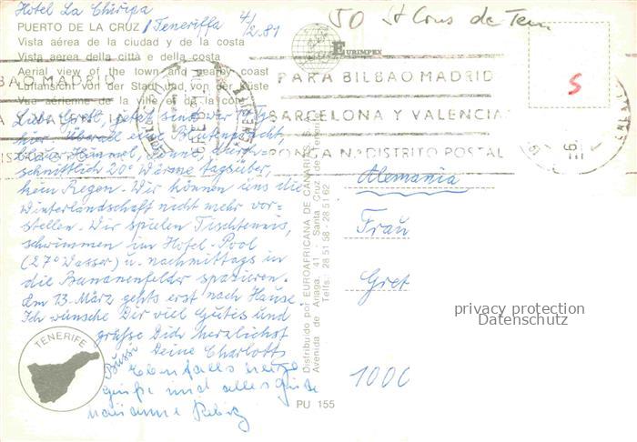 74142424 old postcard Puerto-de-la-Cruz Tenerife ES Kuestenpanorama postalisch gelaufen Fliegeraufnahme Erhaltung siehe scans [FriedD77] KatCode: 11510