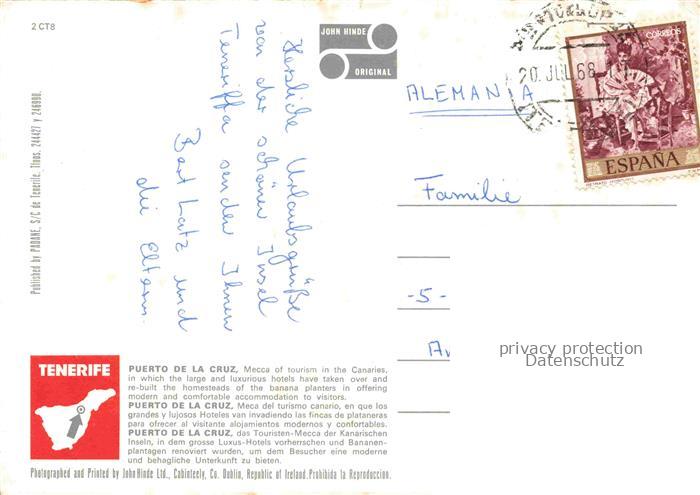 74142427 old postcard Puerto-de-la-Cruz Tenerife ES Panorama Hotels Strand Kueste postalisch gelaufen Fliegeraufnahme Erhaltung siehe scans [FriedD77] KatCode: 11510