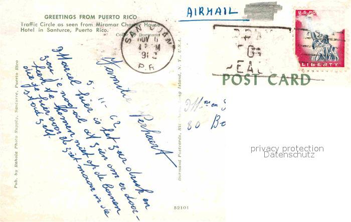 72897810 old postcard Puerto Rico USA Traffic Circle as seen from Miramar Chaster House Hotel in Santurce postalisch gelaufen Erhaltung siehe scans [FriedD77] KatCode: 14140
