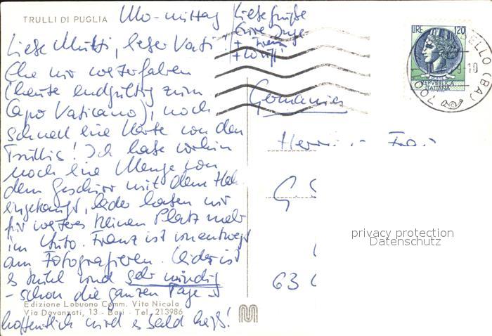 old postcard Puglia Trulli Rundhaeuser postalisch gelaufen Erhaltung siehe scans