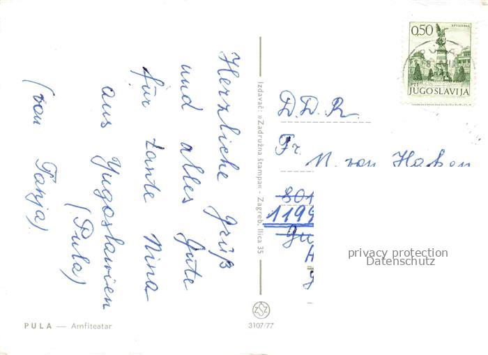 74132338 old postcard Pula Pola Croatia Amphitheater Hafen postalisch gelaufen Fliegeraufnahme Erhaltung siehe scans [FriedD77] KatCode: 11260