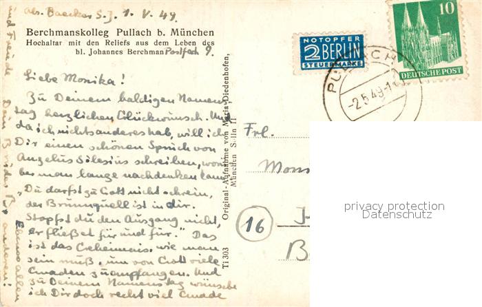 73238619 alte Postkarte Pullach Isartal Berchmanskolleg Hochaltar postalisch gelaufen Erhaltung siehe scans [NatalD47] KatCode: 11110009184139