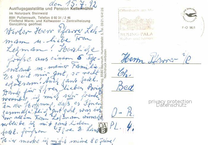 72807540 alte Postkarte Pullenreuth Ausflugsgaststaette Pension Kellermuehle im Steinwald postalisch gelaufen Erhaltung siehe scans [FriedD77] KatCode: 11110009377148