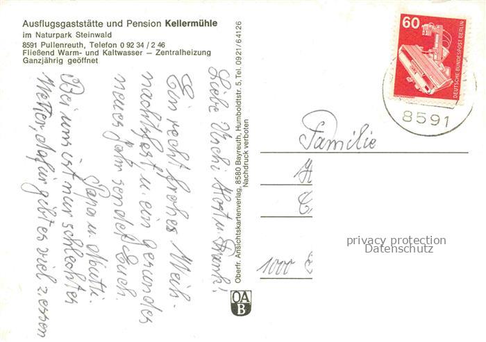 74036440 alte Postkarte Pullenreuth Ausflugsgaststaette Pension Kellermuehle Terrasse postalisch gelaufen Erhaltung siehe scans [FriedD77] KatCode: 11110009377148