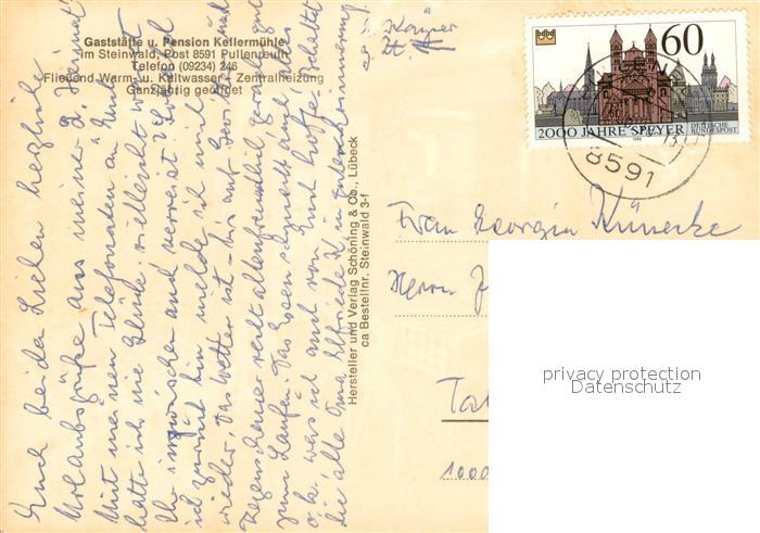 73683754 alte Postkarte Pullenreuth Restaurant Pension Kellermuehle postalisch gelaufen Erhaltung siehe scans [LiesaD40] KatCode: 11110009377148