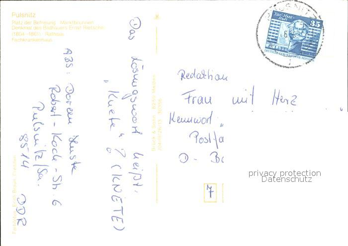 72413612 alte Postkarte Pulsnitz Sachsen Marktbrunnen Platz der Befreiung Denkmal postalisch gelaufen Erhaltung siehe scans KatCode: 11110014292430