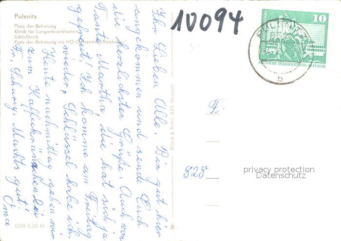 72369946 alte Postkarte Pulsnitz Sachsen Platz der Befreiung Klinik fuer Lungenkranke Schlossteich postalisch gelaufen Erhaltung siehe scans KatCode: 11110014292430