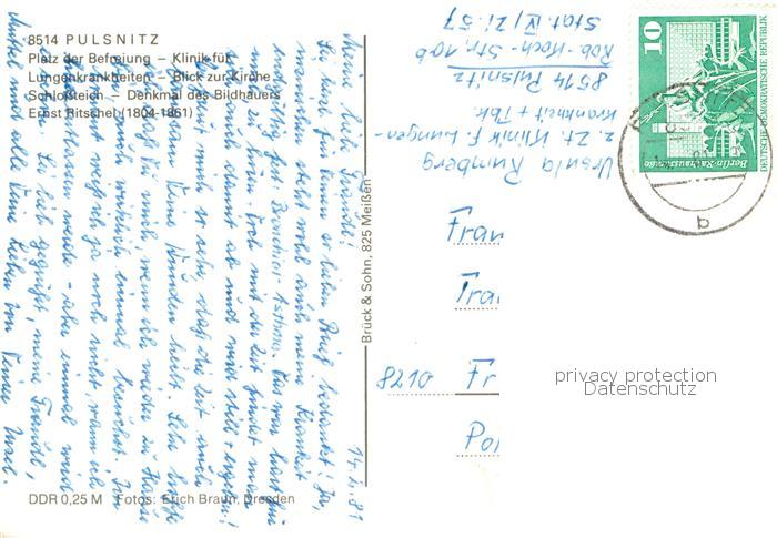 73750805 alte Postkarte Pulsnitz Sachsen Platz der Befreiung Klinik fuer Lungenkrankheit Blick zur Kirche Schlossteich Ernst Ritschel Denkmal postalisch gelaufen Erhaltung siehe scans [WerneD78] KatCode: 11110014292430