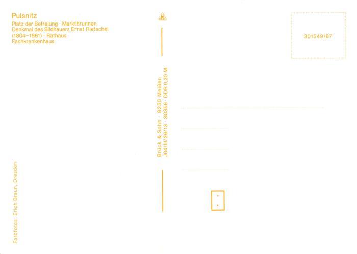73905050 Pulsnitz Sachsen Platz der Befreiung Marktbrunnen Denkmal Ernst Rietschel Rathaus Fachkrankenhaus postalisch nicht gelaufen Erhaltung siehe scans [WerneD78] KatCode: 11110014292430
