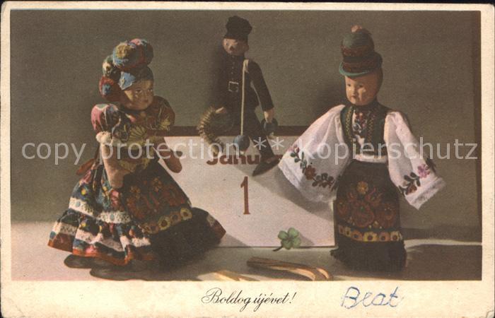 alte Postkarte Puppe Doll Poupee Kinderspielzeug Ungarn Neujahr Schornsteinfeger postalisch gelaufen Erhaltung siehe scans