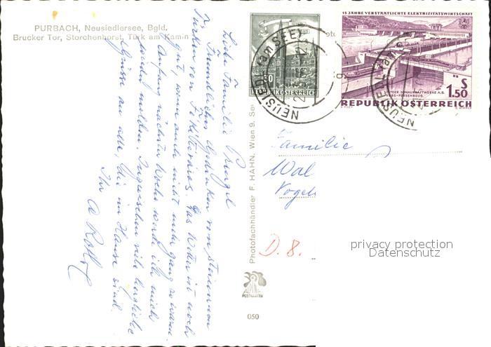72126257 alte Postkarte Purbach Neusiedler See Brucker Tor Storchennest Tuerk am Kamin Skulptur postalisch gelaufen Erhaltung siehe scans KatCode: 11390112010312