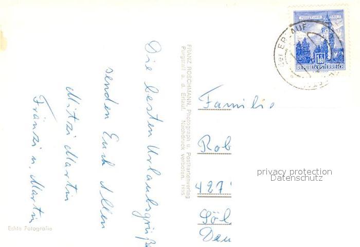 72925401 alte Postkarte Purgstall Erlauf Ortsansicht mit Kirche Freibad Erlauf Wehr Flusslauf Felsen postalisch gelaufen Erhaltung siehe scans [FriedD77] KatCode: 11390121032008