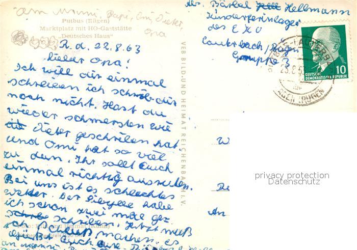 73135631 alte Postkarte Putbus Ruegen Marktplatz mit HO Gaststaette Deutsches Haus Denkmal postalisch gelaufen Erhaltung siehe scans [FriedD77] KatCode: 11110013061028