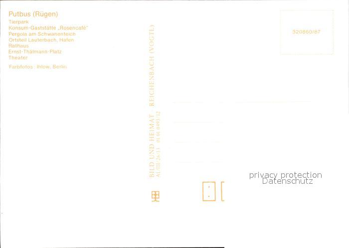 72576130 Putbus Ruegen Tierpark Konsum Gaststaette Pergola Schwanenteich Hafen Lauterbach Rathaus Ernst Thaelmann Platz Theater Wappen postalisch nicht gelaufen Erhaltung siehe scans [FriedD77] KatCode: 11110013061028