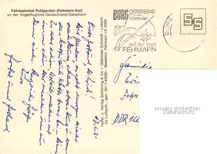 73656405 alte Postkarte Puttgarden Faehrbahnhof Fehmarn Kai Fliegeraufnahme postalisch gelaufen Erhaltung siehe scans [WerneD78] KatCode: 11110001055046