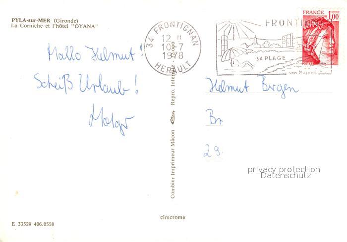 13215581 carte postale Pyla sur Mer Fliegeraufnahme Corniche et Hotel Oyana postalisch gelaufen Erhaltung siehe scans [LiesaD40] KatCode: 11170033633529