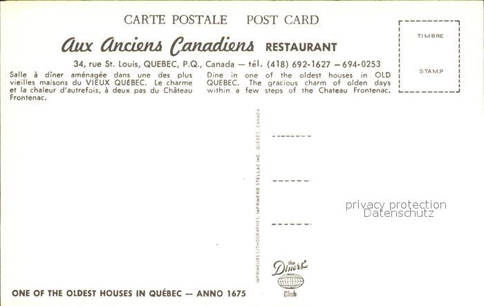 Quebec Aux Anciens Canadiens Restaurant postalisch nicht gelaufen Erhaltung siehe scans