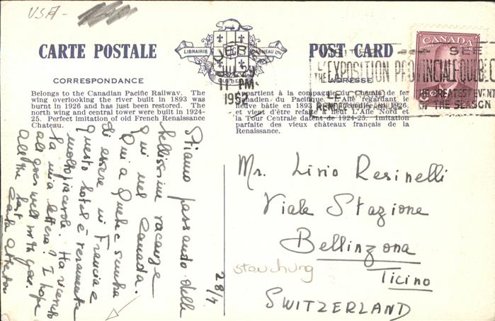 old postcard Quebec Champlain Monument and Chateau Frontenac Hotel Renaissance Imitation postalisch gelaufen Erhaltung siehe scans