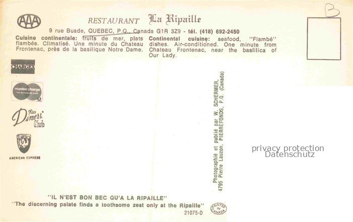 74141664 QUEBEC-City Canada Restaurant La Ripaille postalisch nicht gelaufen Erhaltung siehe scans [WerneD78] KatCode: 14110