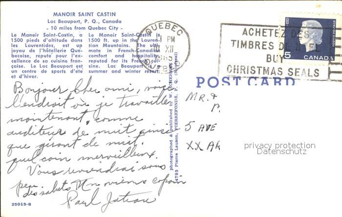 old postcard Quebec Manoir Saint Castin Lac Beauport postalisch gelaufen Erhaltung siehe scans