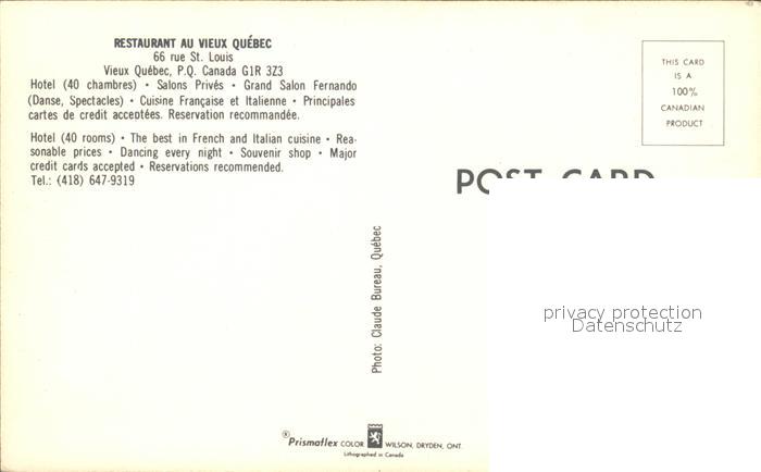 Quebec Restaurant Au Vieux Quebec postalisch nicht gelaufen Erhaltung siehe scans